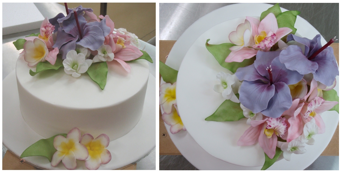 This pretty single tier cake was created for a small spring garden wedding. Although it may look quite simple in it's design, a plain white fondant covered cake is often the hardest to do as it will show every lump and bump if you make an error. The fondant has to be rolled thinly with precision and the cake must have a crisp sharp edge. The sugar flowers on this cake are all hand made and I think this is a lovely example of how good things can come in small packages.